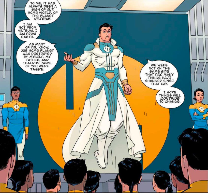 Kirkman’s new idea of justice isn’t about empowering people, though. Instead it’s about the empowerment of one super someone. Galactic justice and mercy come about because of the eventual wise rule of Mark, who it turns out has a hereditary claim to Viltrumite leadership. Justice in Invincible doesn’t mean reducing power differentials. It means finding a more just, and ever more powerful, ruler.