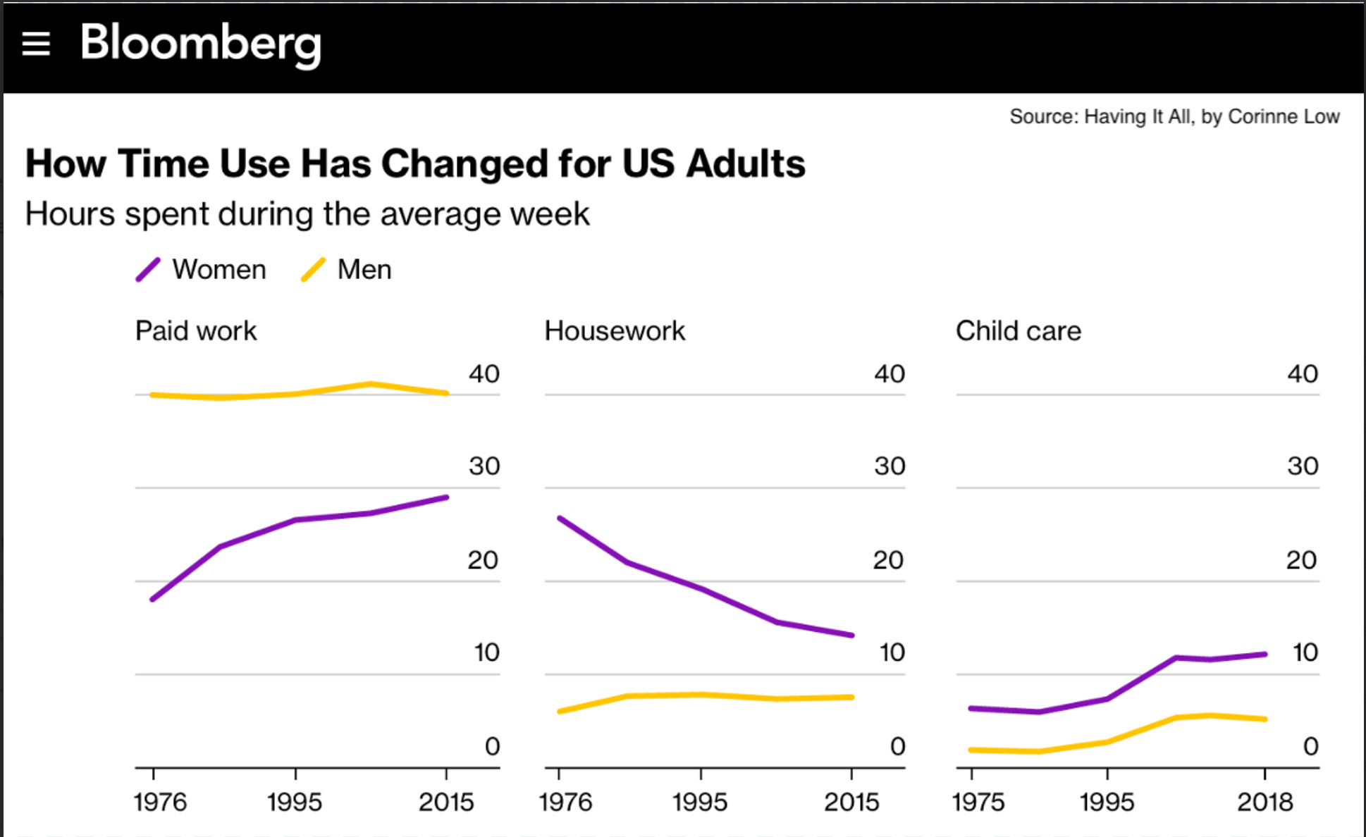 And then with housework, men’s time hasn’t increased at all. Even when a woman is the primary breadwinner, she still does twice as much cooking and cleaning as her lower earning male partner. So if you compare a very high-powered woman at work to her male colleague in that same position, he is doing much less at home. And that means that he has more hours to invest in career growth.