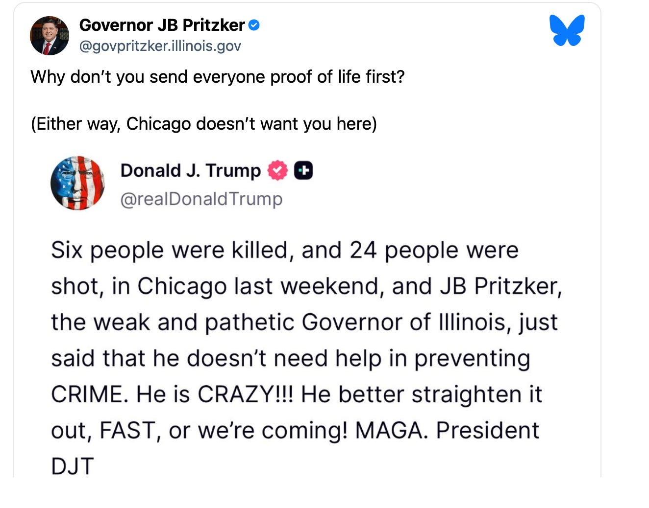 Trump giving up here may not be widely reported; a dog not barking isn’t usually seen as a headline. But even though everything broadly remains horrible, I think it’s important to highlight these wins and to celebrate them. Chicago and Pritzker remind us that Trump triumph is not inevitable, and that his power has real logistical limits. He depends on people caving; he depends on people compromising. If you don’t, he folds. One victory isn’t winning the war. But it reminds us what winning the war might look like.