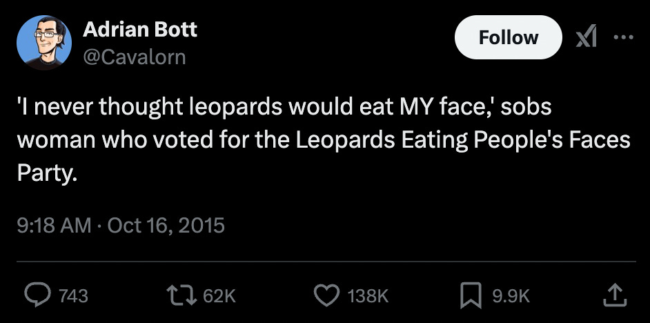 I think that any path out of fascism is going to mean holding fascists accountable. Trump and his cronies and everyone in ICE needs to be investigated and ideally prosecuted. People who voted for Trump also committed an evil act—but in many cases, for those voters the crime is going to lead to its own punishment. That’s not something to celebrate, in part because punishment in these cases tends to ripple out to harm a lot of other people. But I think standing against all suffering, and pointing out that we can all build a better world together, seems like a better politics than laughing and pointing at the leopards eating faces, even if a few of those faces are attached to people who were laughing and pointing themselves not that long ago.