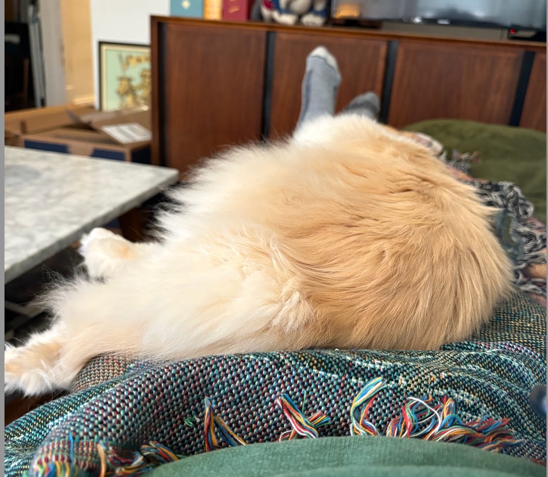 Back in the saddle here after a week of somewhat erratic posting since I was out of town. Now I am scribbling away with a floof atop me, as it should be.