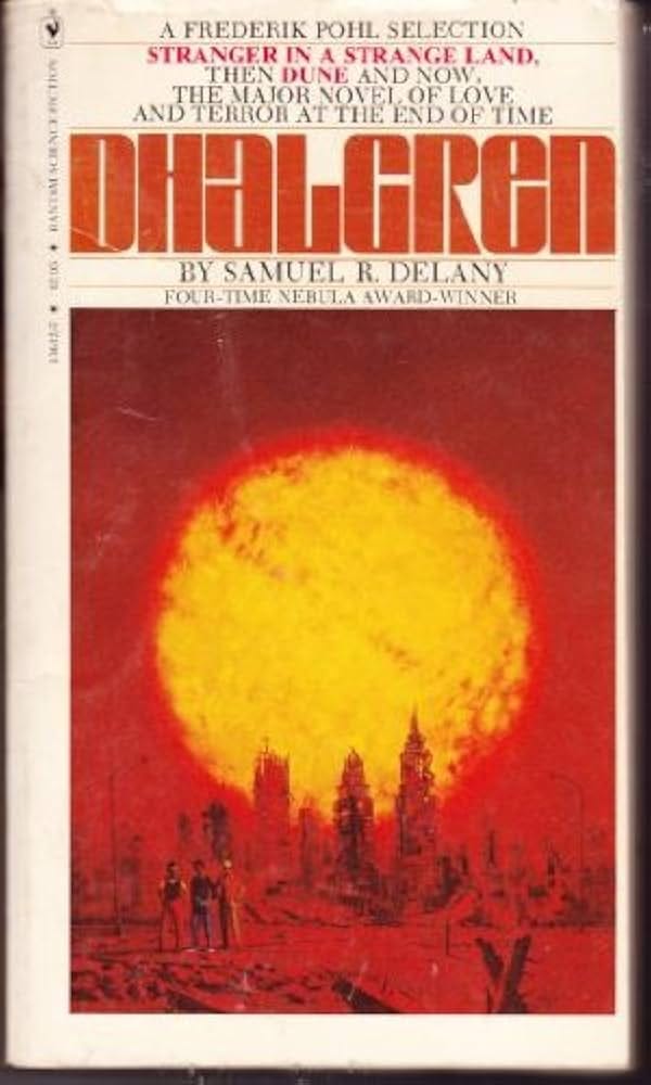 Dhalgren, published in 1975, is a sprawling, 900 page hallucinatory semi-dystopian, semi-utopian, sf lit fic hippie anarchist romp. The main character, Kidd (or the kid) is a bisexual downwardly mobile drifter who travels to Bellona, a city in the American Midwest which has come disconnected from time and reality in obscure ways. In the city, Kidd becomes a member of a (mostly pro-social) street gang called the Scorpions, writes and publishes a book of poetry, and has lots and lots of sweaty, dirty, sticky sex with basically everyone.
